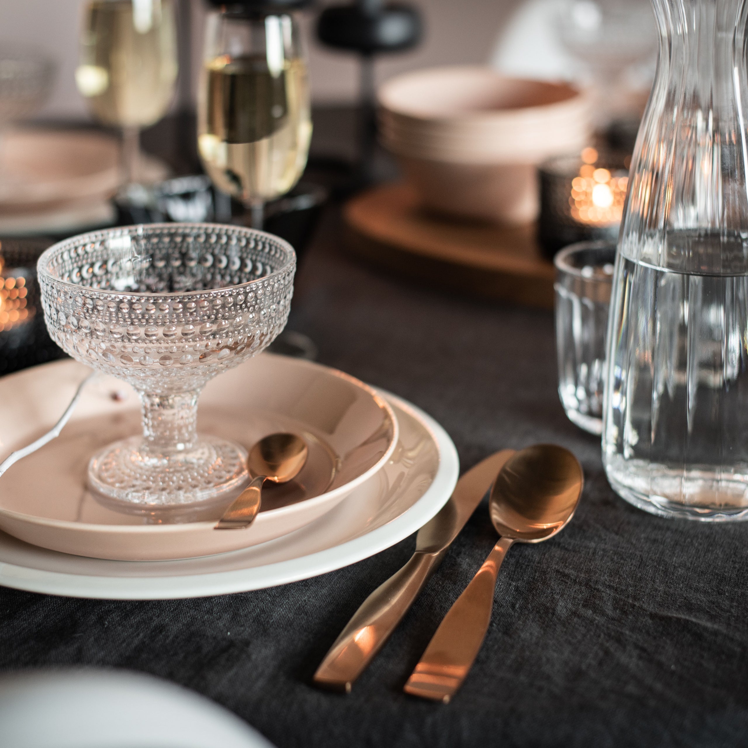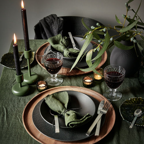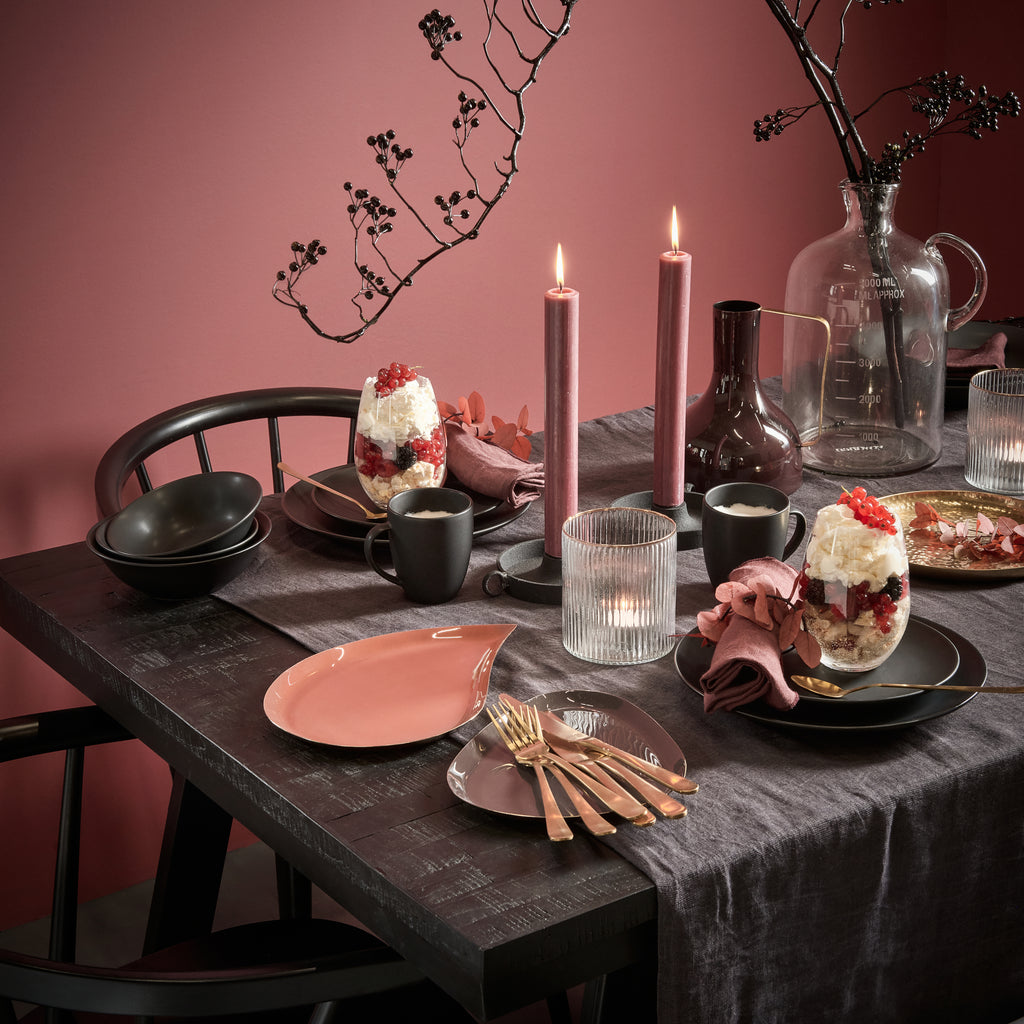In het interieur was het al een tijdje een trend: een warme en luxe uitstraling. Deze trend zien we nu ook steeds meer terug in het servies en de overige tafelaankleding. Er wordt op tafel veel gebruik gemaakt van sierlijke vormen, donkere kleuren en glanzende materialen. Diepe rood-, groen- en blauwtinten worden gecombineerd met kleuren zoals zwart, grijs en goud. Zo krijgt jouw tafel thuis meteen de uitstraling van een chic sterrenrestaurant!