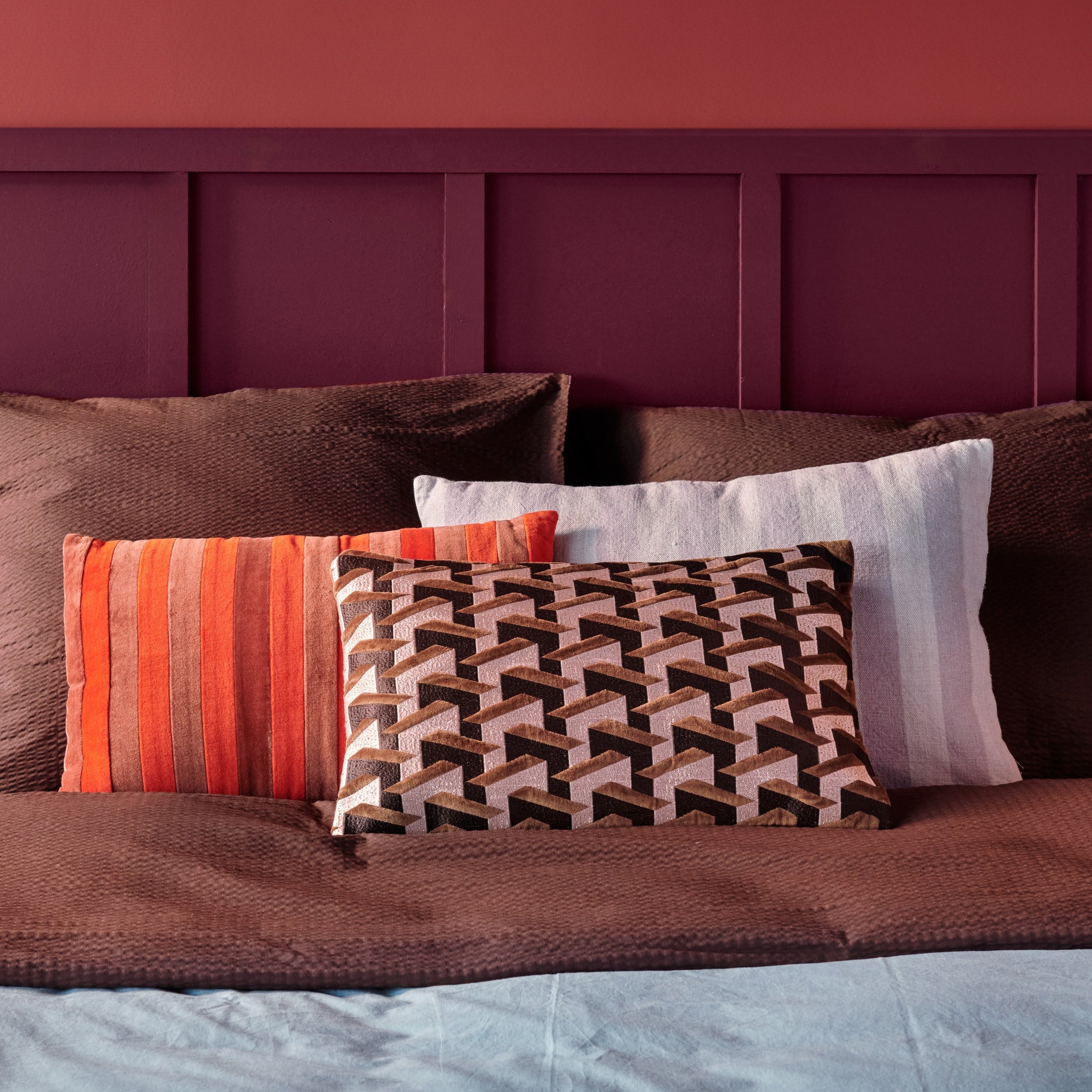 De slaapkamer komt tot leven met het rijke kleurenpalet uit de najaarstrend Privacy Mode. De combinatie van steenrood, zeeblauw en gebroken wit geeft een gevoel van warmte, geborgenheid en klassieke elegantie. Een effen dekbedovertrek in een diepe kleur past goed in deze trend én zorgt voor een knusse en sfeervolle slaapkamer. Gooi een sprei over het bed met een wat drukkere, robuuste print om de look helemaal af te maken.