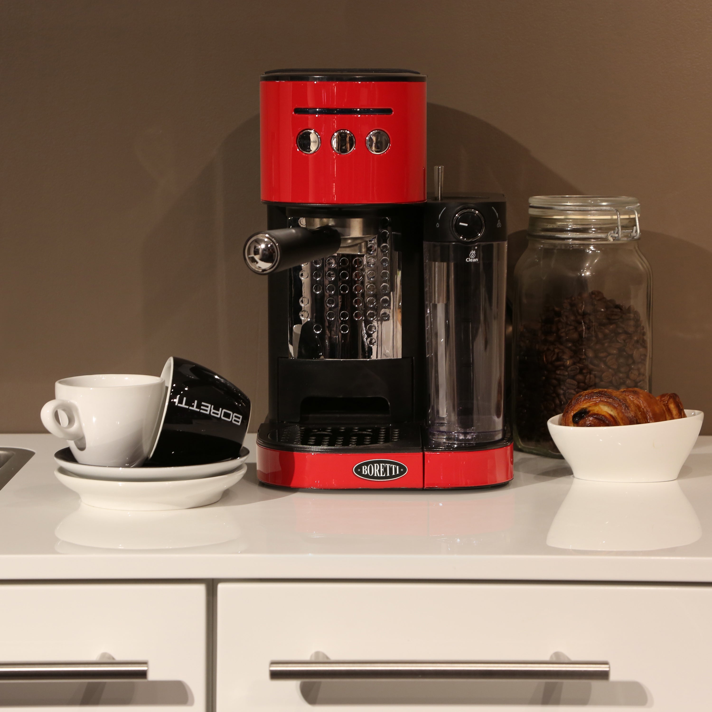 Schoonmaken Het melkreservoir mag in de vaatwasser. Daarnaast bevat de Boretti een automatisch programma voor het schoonmaken van het melksysteem. De Latte/clean-knop druk je drie seconden in. De Boretti geeft dan stoom af en maakt hiermee het reservoir schoon. Ook het brouwhoofd en het portafilter maak je eenvoudig schoon. Deze mogen niet in de vaatwasser maar maak je schoon met warm water en zeep.