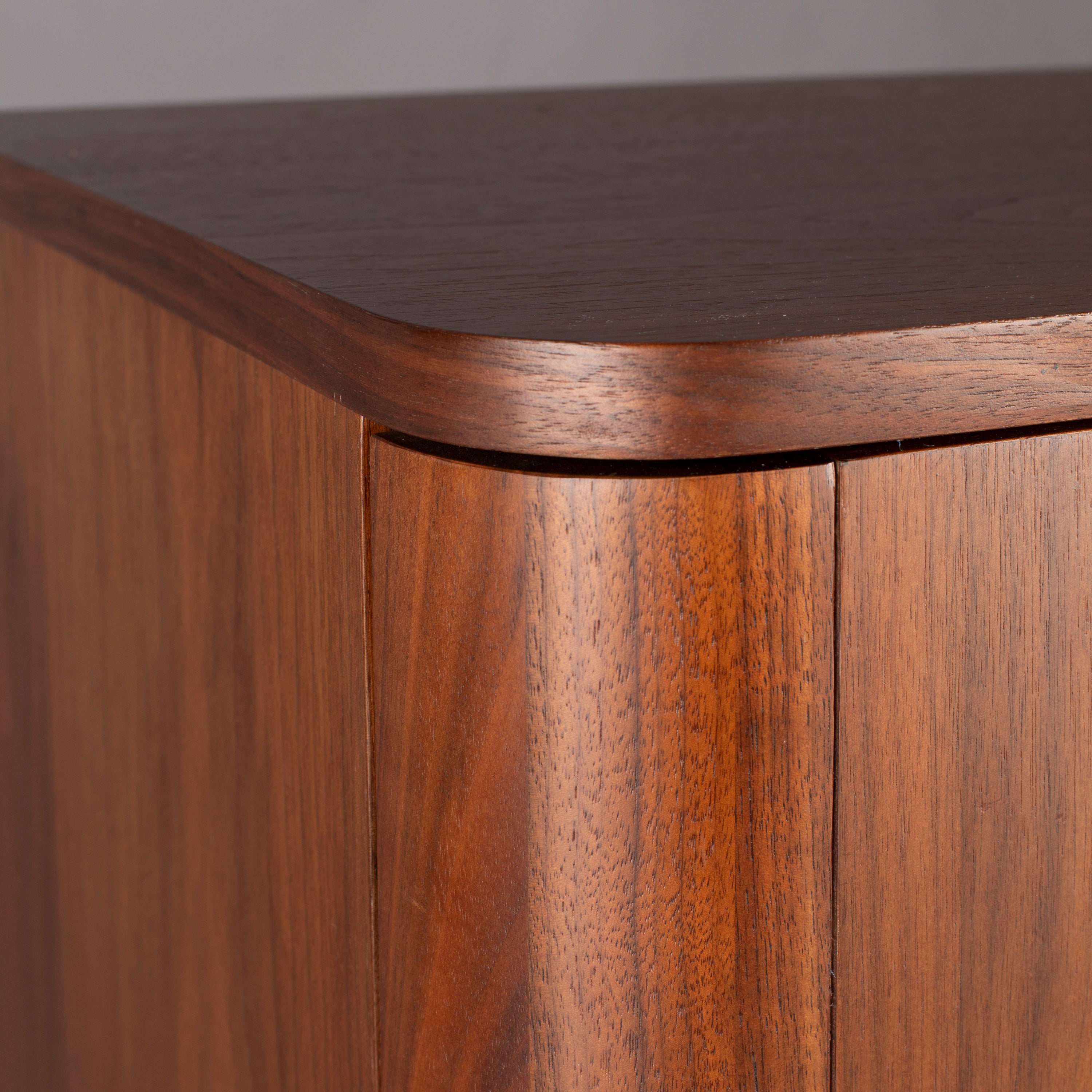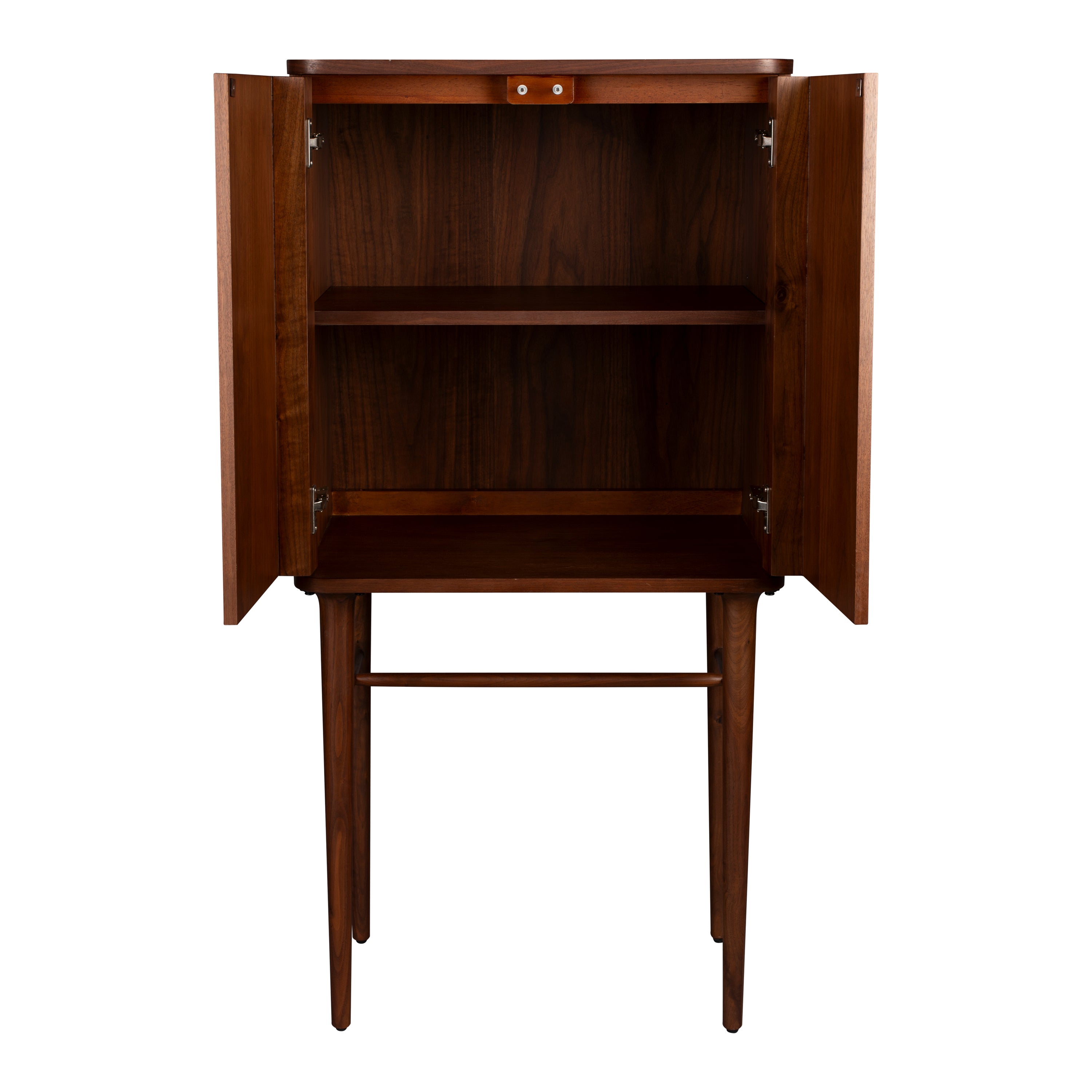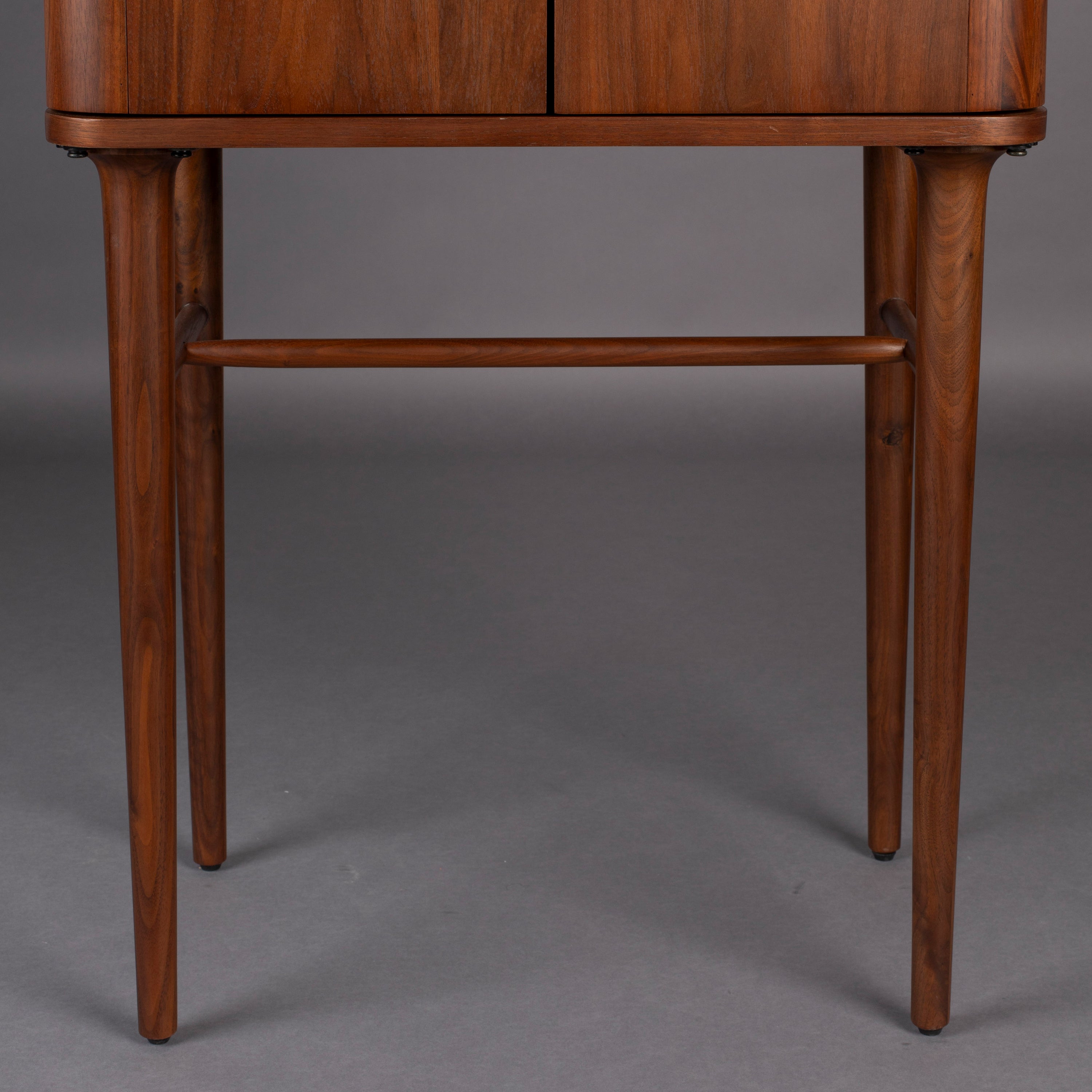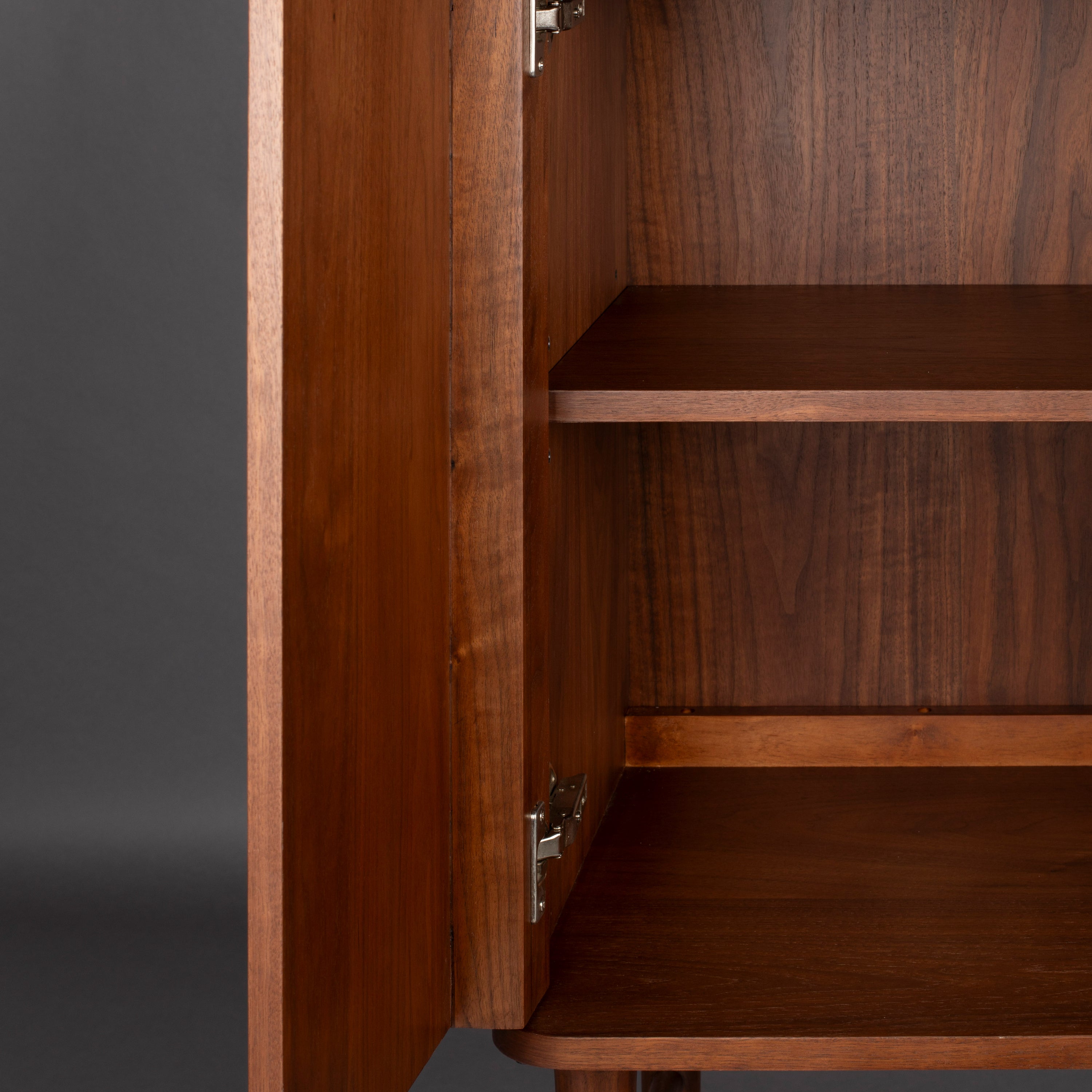 - De kast is gemaakt van walnootfineer en staat op massief walnoothouten poten