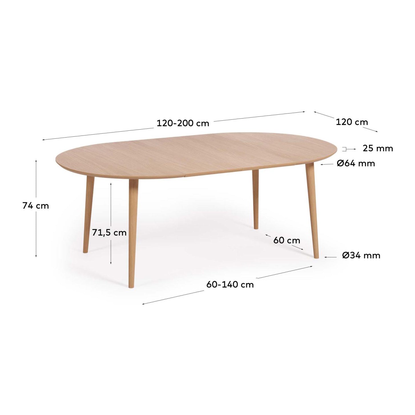 - Een ronde tafel van H 74 x L 120/200 x D 120 cm