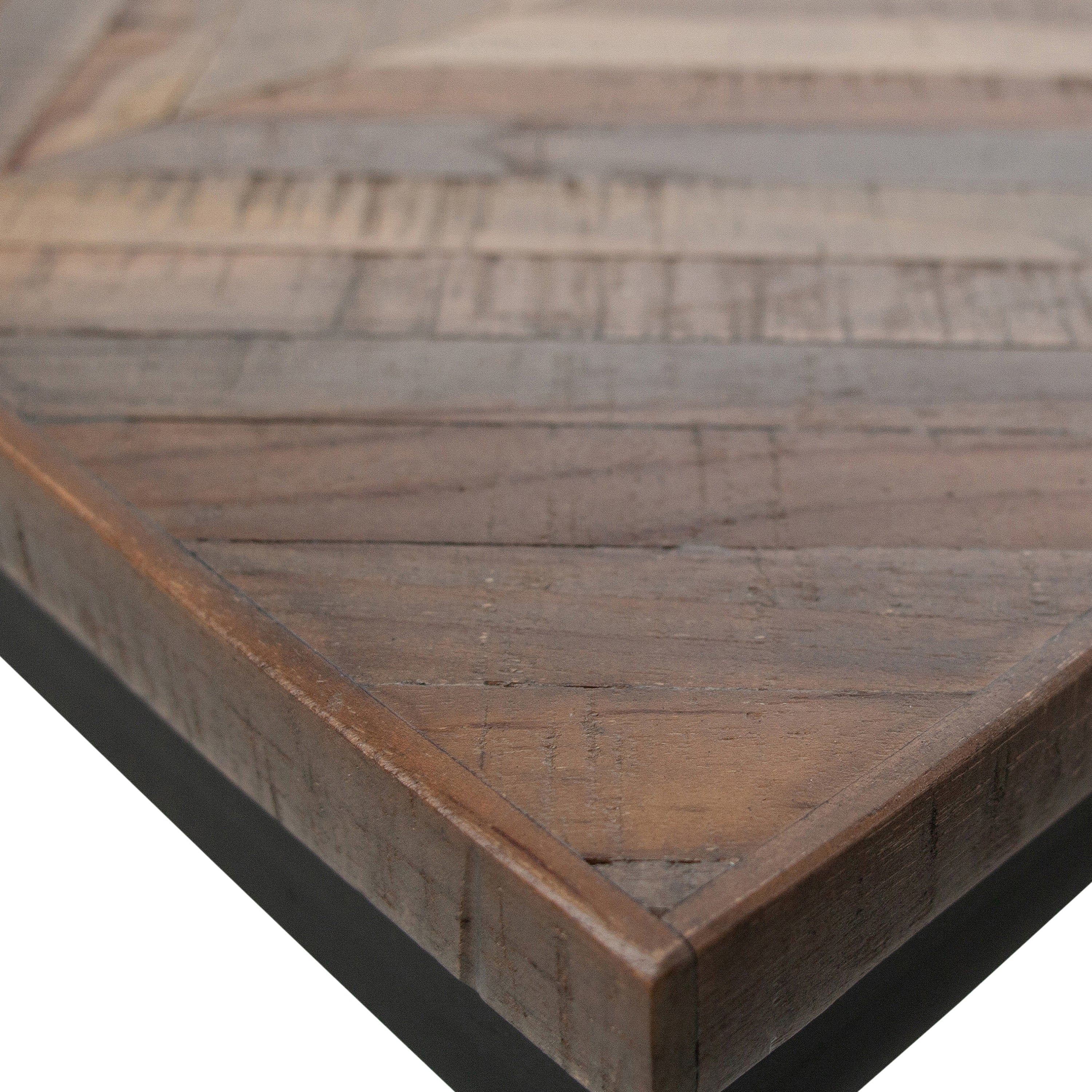 Eettafel Rhombic is van het Nederlandse merk WOOOD. De tafel is gemaakt van 100% gerecycled teakhout. In gerecycled teakhout is er geen FSC-certificaat afgegeven omdat het hout afkomstig is van oude teakhouten stammen. Het topblad is gemaakt van kleine latjes gerecycled teakhout. Deze latjes zijn bevestigd op een MDF - Multiplex plaat.